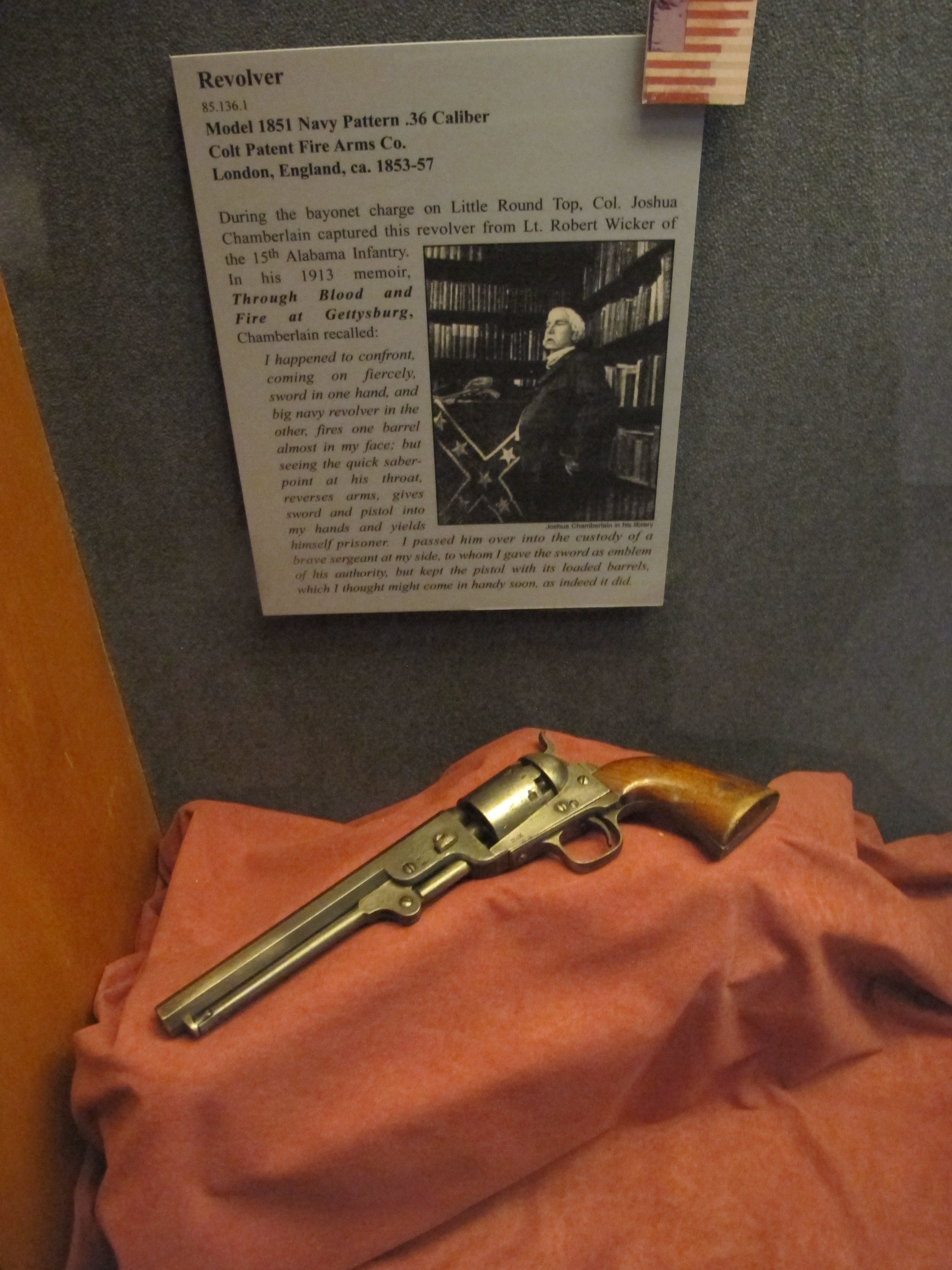IMG_1754 Published January 4, 2018 at 2736 × 3648 in Flag Day ← Previous The pistol that Joshua Chamberlain captured on Little Round Top.